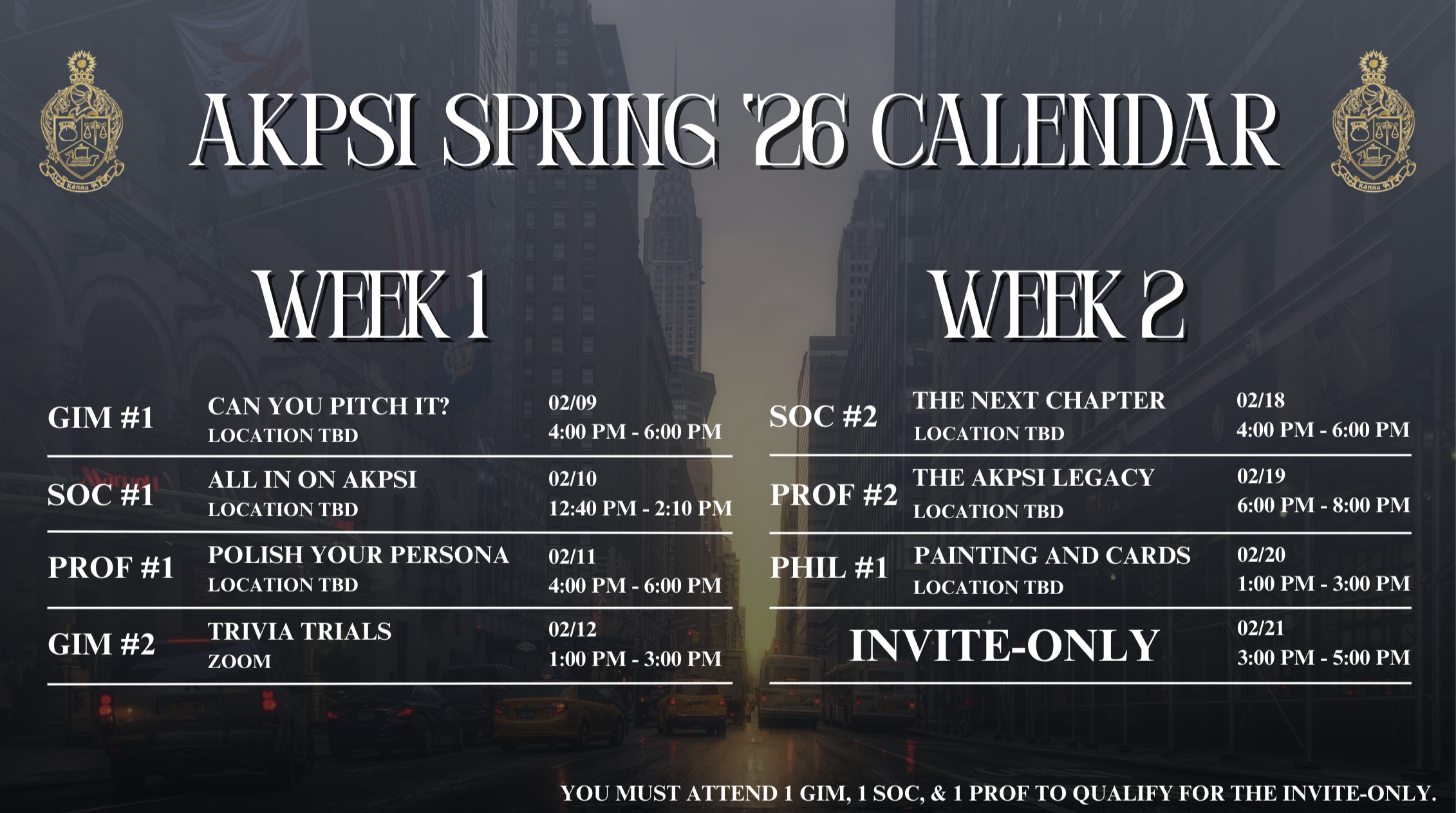 To qualify for an interview, each rushee must have attended a total of three events - 1 GIM, 1 Professional, and 1 Philanthropy OR Social event.